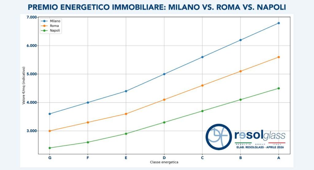Secondo le elaborazioni Resolglass, il differenziale di prezzo associato alla qualità energetica può arrivare fino all’+80% tra edifici in classe G e classe A, con scarti fino a +800 €/mq e dinamiche ancora più marcate nei grandi mercati urbani come Milano, Roma e Napoli, dove il differenziale tra immobili inefficienti ed efficienti può sfiorare anche i 3.000 euro al metro quadro.